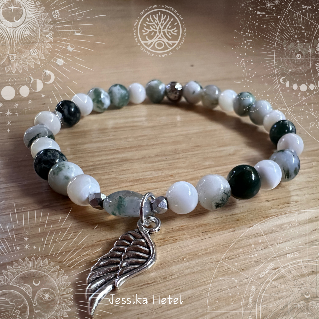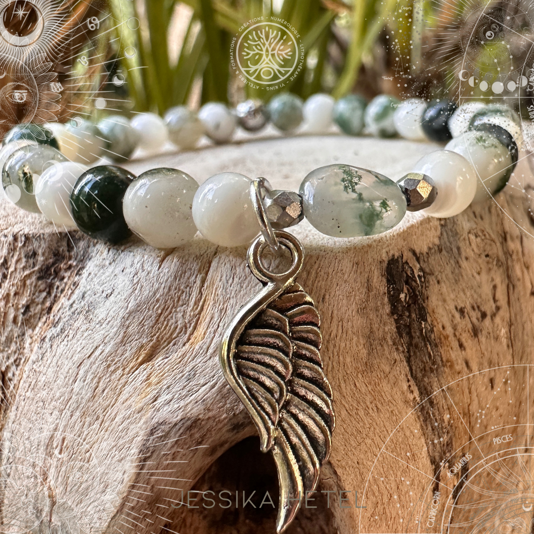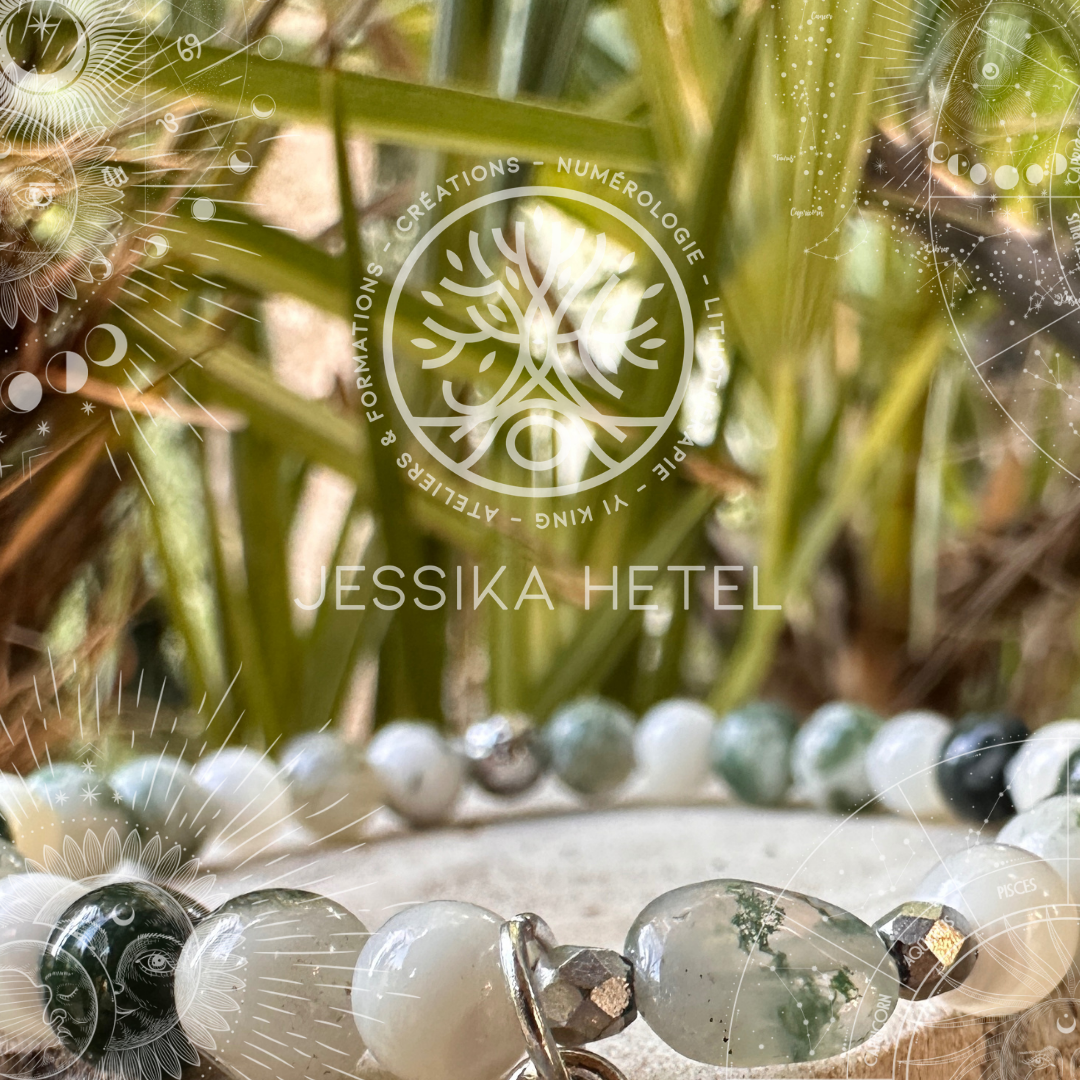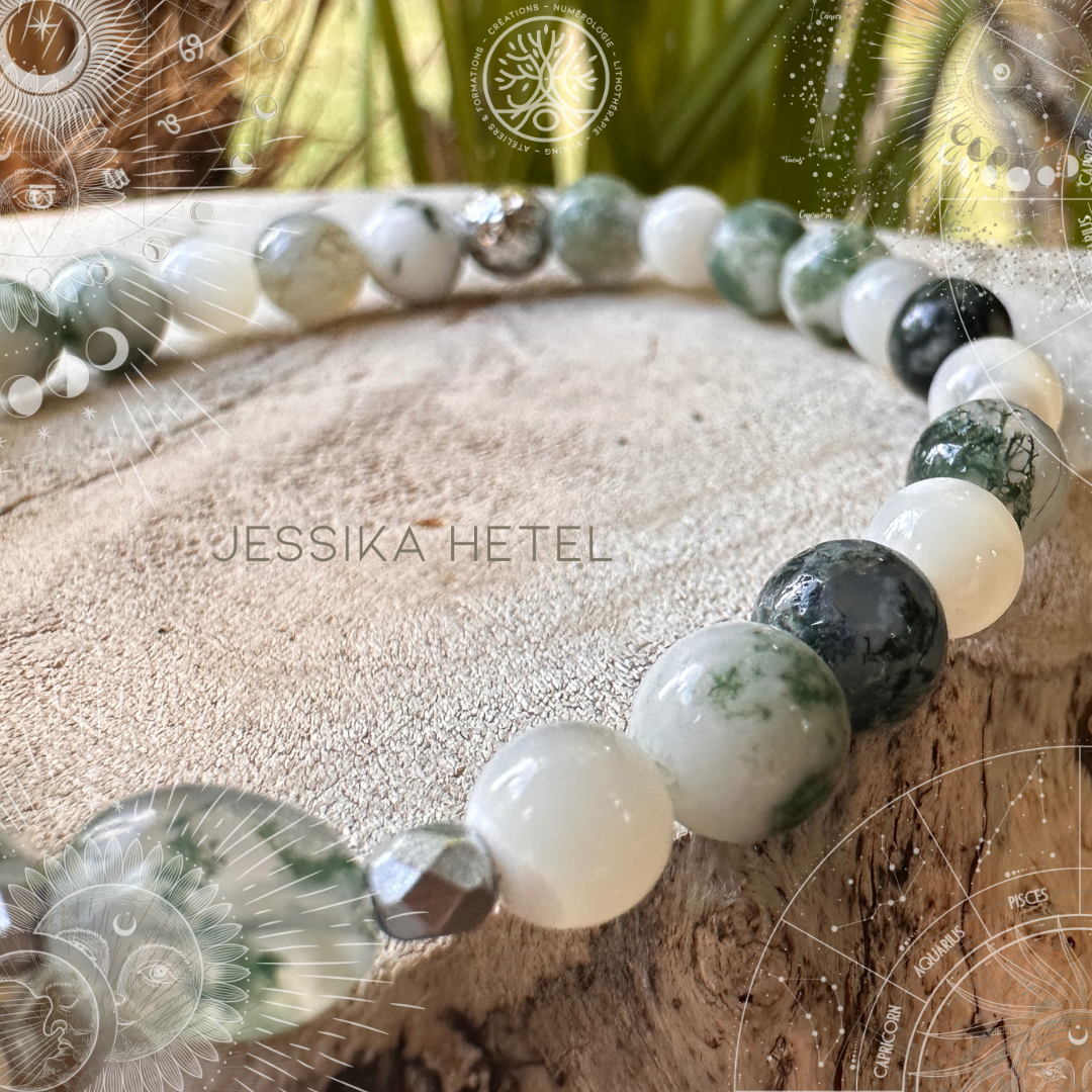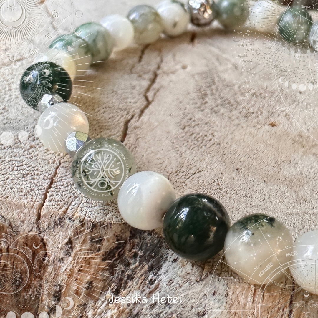 L'agate arbre, avec ses motifs verts distinctifs, évoque la sérénité et l'harmonie de la nature. La nacre, réputée pour son éclat irisé et ses reflets subtils, ajoute une note de pureté et d'élégance, contrastant magnifiquement avec les teintes vertes de l'agate. Le jade, symbole de sagesse et de paix intérieure, complète cette trilogie en apportant une profondeur apaisante et une touche de mystère.